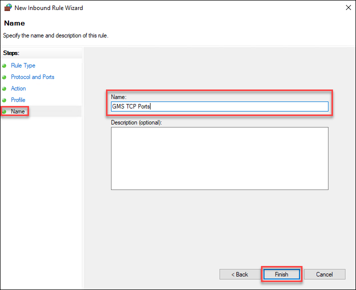 - In the Name field, type the name for this rule. (For example, GMS TCP Ports.)