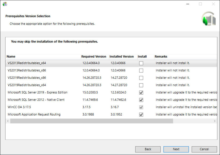 - During the upgrade, the already installed mandatory prerequisite WinCC OA is upgraded to WinCC OA 3.17 by uninstalling the installed version and installing the required version.