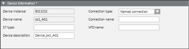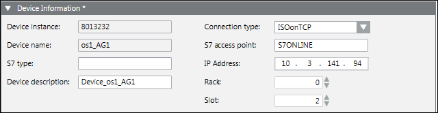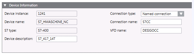 This expander displays the S7 device data settings. You can view the Device instance (S7 device numeric ID) and Device Name (name of the S7 device) and modify the following parameters:
