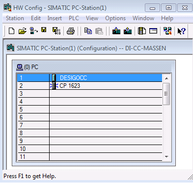 - On the STEP7 engineering computer, insert a SIMATIC PC-Station in the STEP7 project. The SIMATIC PC-Station consists of a user application SW 8.1.2, for example, DESIGOCC, and the CP1623.