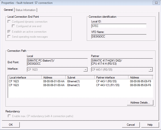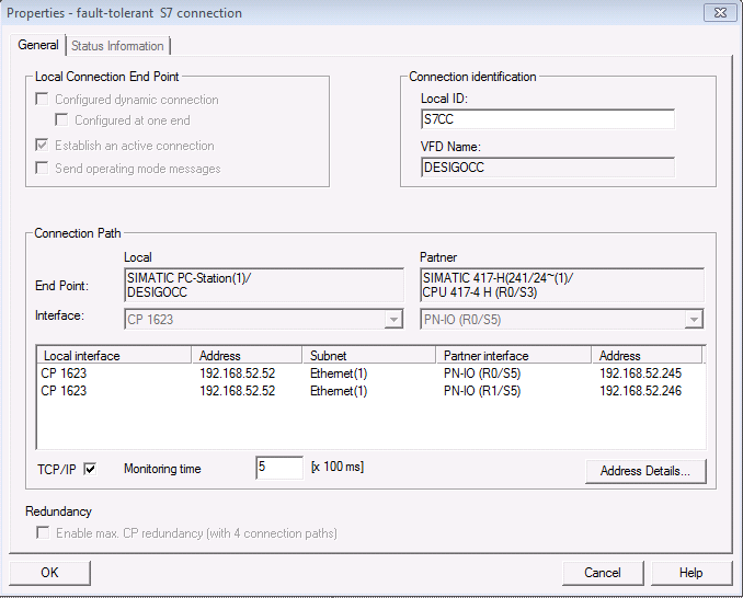 - The Properties – fault-tolerant S7 connection window displays.