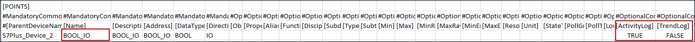 ValueLog | Status of the VL flag for the point. The possible values are: FALSE or 0 – Turns OFF the VL flag for the point on importing the CSV. NOTE: If no value is specified in this field, then the current state of the point will be retained on re-importing the CSV file. |