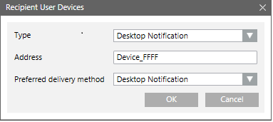 - The user device type is automatically configured. In the Recipient Editor tab, under the User Device Types expander, you can see that the Desktop Notification Driver is set as the handling driver and modality is set as Desktop Notification.