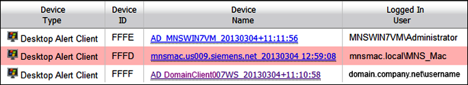 - The View Device Status Report page displays all the connected clients. The image below shows some of the columns of the table that is of use for Notification. The user can scroll to the right to actually see the Logged In User column.
