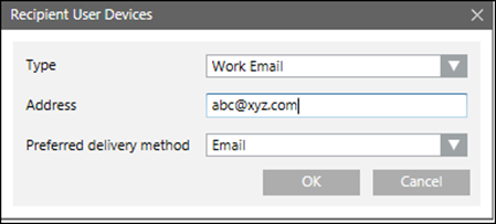 In the Recipient User Devices dialog box, from the Type drop-down list, select Personal Email or Work Email as a recipient device for the corresponding recipient user.
