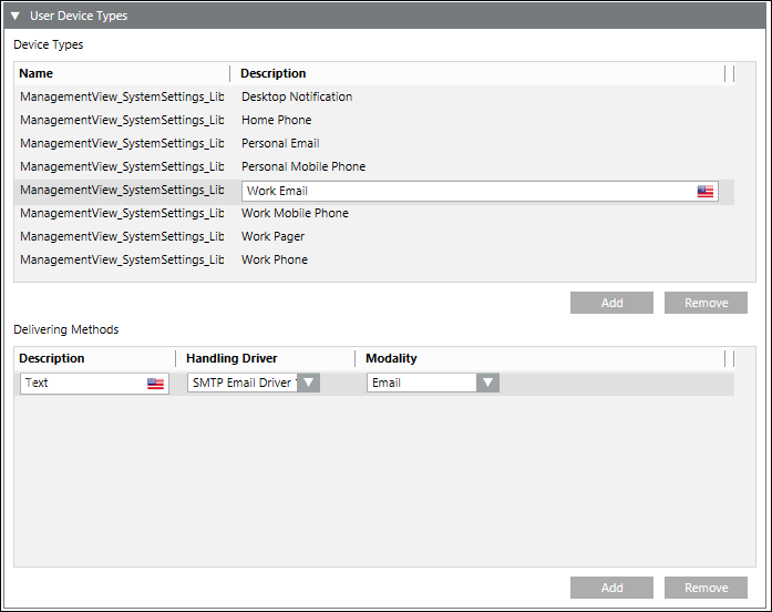 The user device type is automatically configured. In the Recipient Editor tab, under the User Device Types expander, you can see that the SMTP Email Driver is set as the handling driver and modality is set as Email.