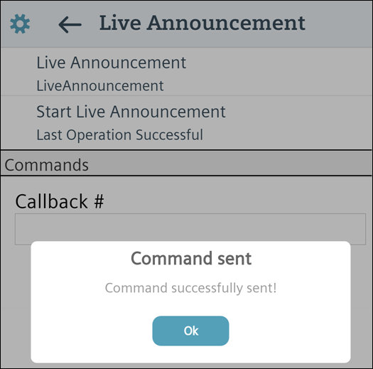 The selected live announcement is successfully launched. If the callback settings were set correctly, wait for the system to call back, answer the call and perform the live announcement.