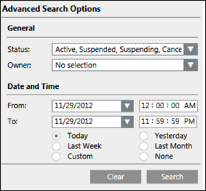 - Status: Searches for the incident according to its status. For example, active, suspended, suspending, canceled, canceling, completed, all clear, and closed.
