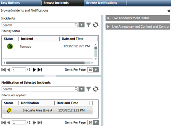 After an incident is initiated and the Browse screen is displayed, the highest ordered notification from the incident template structure is selected by default and the details of the corresponding notification is displayed. In case when the highest ordered notification is a live announcement, the Browse screen displays the live announcement details and the Start Live Announcement button is highlighted. Alternatively, select a notification associated with an incident to view the details of the selected notification. The following image displays the details of a message template: