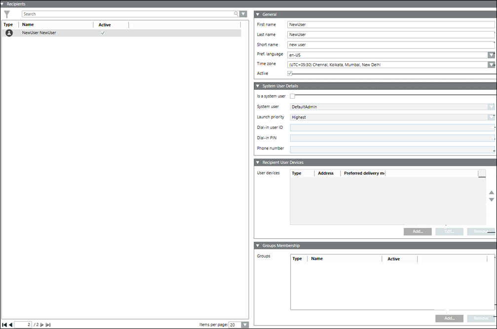 7 | Is a system user (Available only for MNS license users) | Associates recipient user details with a system user account and enables delivery of notifications to this system user. |