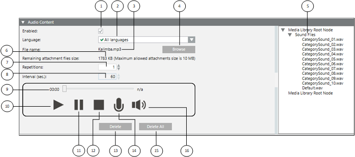 4 | Browse | Allows you to browse the local file system and upload a file as audio content. You can upload MP3 and WAV files. |