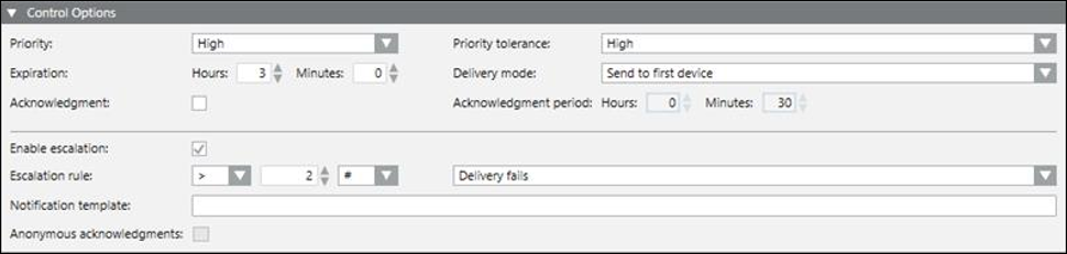 - Control Options: Configure the message priority, priority tolerance, escalation with other details like delivery mode and expiration time.
