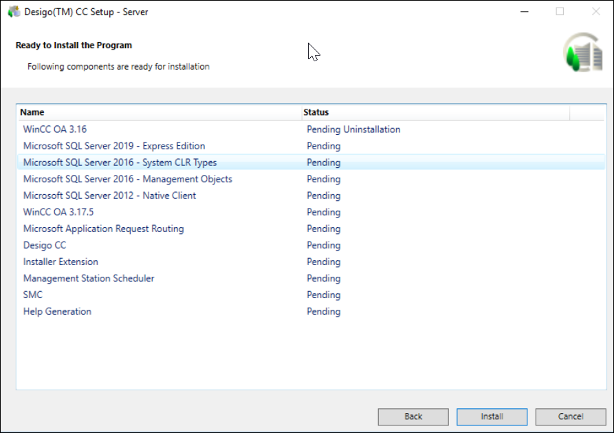 - Click Next to display the Ready to Install the Program dialog box listing the status of the prerequisites, Desigo CC installation, extension modules installation, help merging status, and the status of the post-installation steps that you selected for execution and status for those which are executed mandatorily.