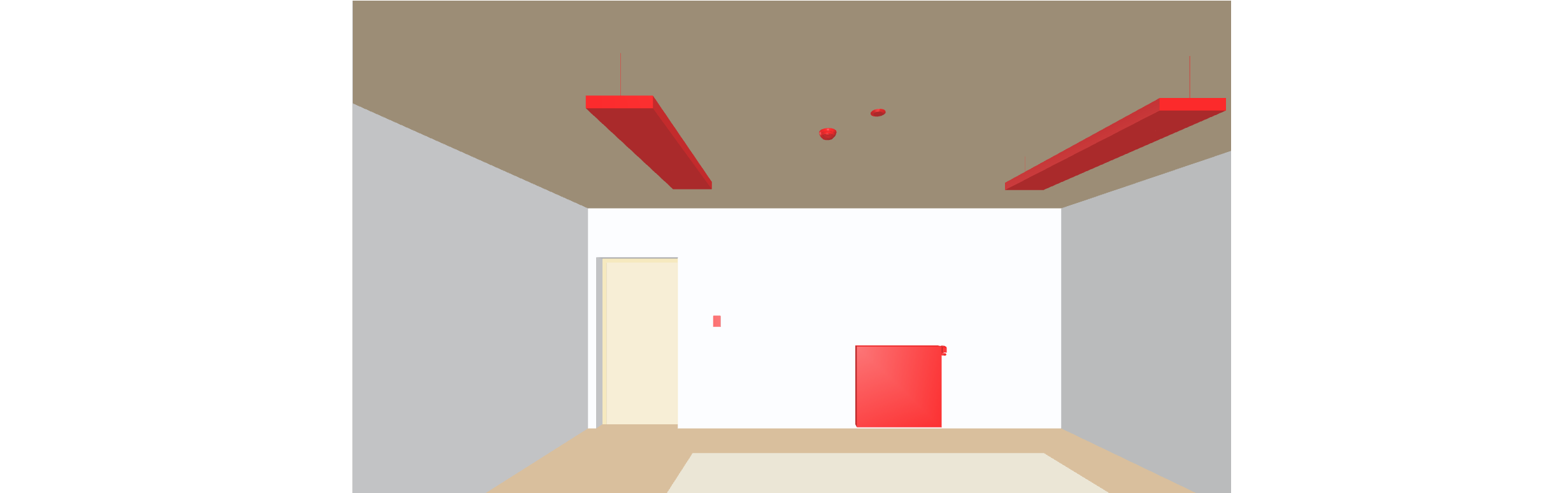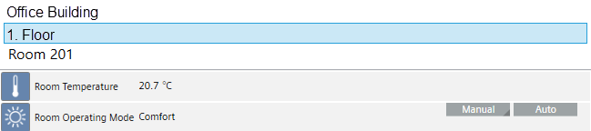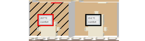 | Displays the room information for temperature and occupancy state. The selected room value display is displayed in the center of the room in red. |