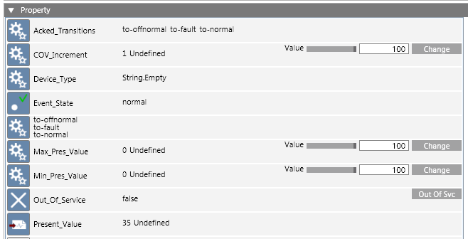 The Property section shows, by default, any additional BACnet properties not displayed in any other sections of this application. Properties that you can update have visible fields and buttons. Only properties with simple data types are displayed.