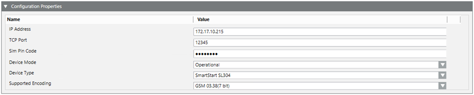 The GSM Modem driver is automatically associated to the field network. In the Network Editor tab, under the Network Settings expander, you can see that the values are preselected, and the driver is already assigned. NOTE: In case of using Cinteron and SmartStart devices as GSM devices, refer to the note mentioned in Step 3 - Create a GSM Modem Field Network in Creating and Configuring Serial Modem topic.