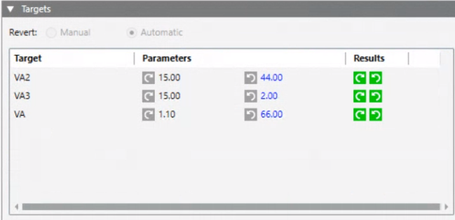 At the top of the Targets expander, the Revert field indicates how the commanded targets are set back to their original values, for example, from Unlocked back to Locked, when the task ends: