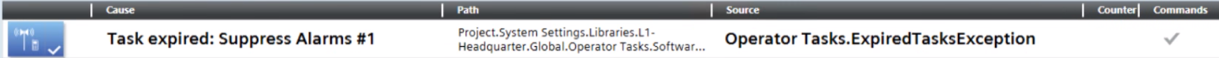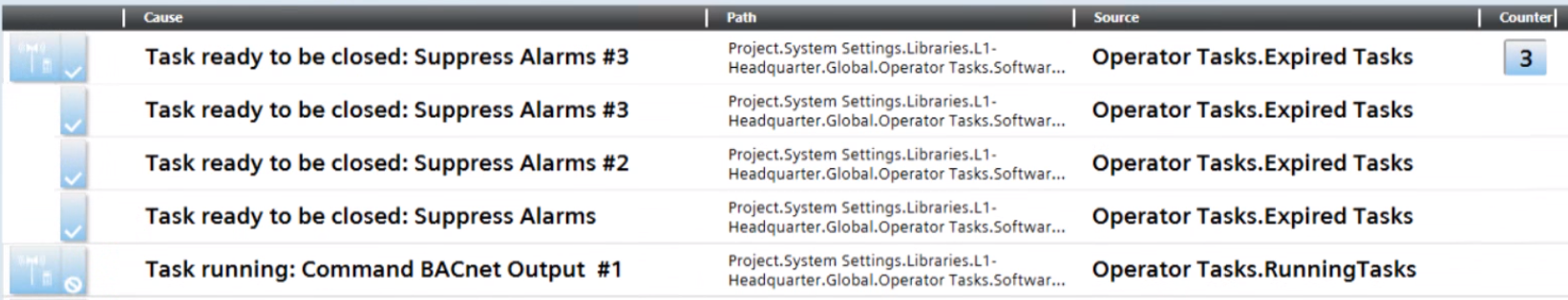 In Event List, such events are grouped together under a parent event, one for Operator Tasks.Running Tasks, one for Operator Task.Expired Tasks (Ready to be closed), and one for Operator Tasks.Expired Tasks Exception, each one acting as a container of the corresponding events. The Counter column indicates the total number of occurred notifications per type. This counter automatically increments whenever the same event occurs.