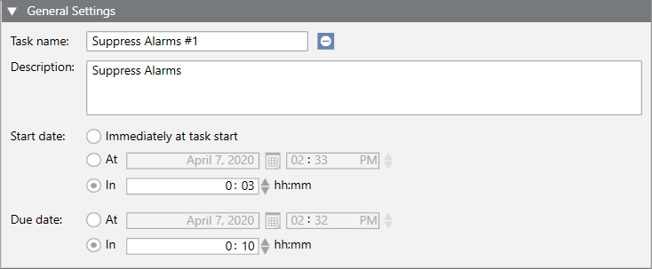 - In: The task ends when the specified duration has elapsed from when the Start command is clicked. Cannot be zero.