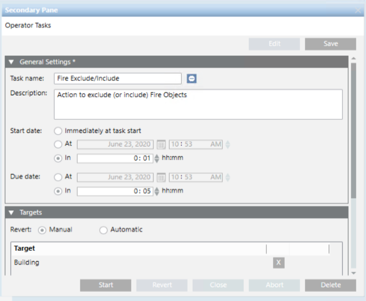 - The task editing fields display in the Secondary pane. In the Targets expander, the target is automatically set based on the selected object. In this example, Building.