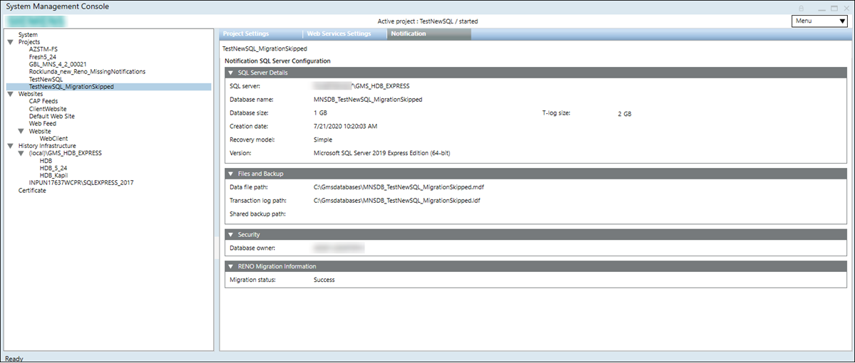 Once the project is upgraded, the migration status displays in the Notification tab in SMC under the RENO Migration Information expander as follows.