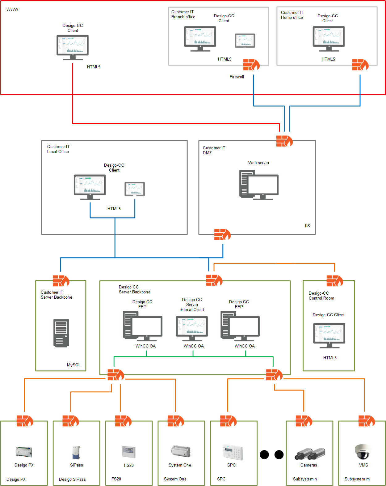 This is the configuration choice for the cases where multiple installed clients, connected through a dedicated or shared LAN, are required. Internet web connectivity is required for Desigo CC web-based clients and/or external applications through the Web Service Interface (WSI). The web server (IIS) is installed on a separate computer (remote web server), in a DMZ zone.