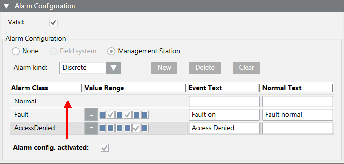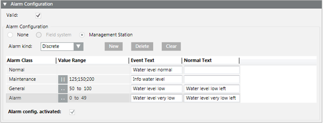 - In the Alarm Configuration expander, the Alarm config. activated check box is selected.