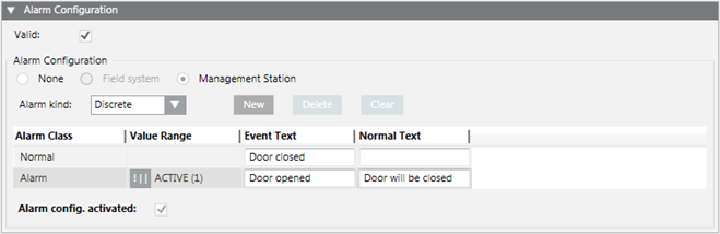 - In the Alarm Configuration expander, select the Valid check box to display activation in grey.