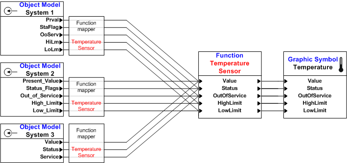 The various names (for example, PrVal = Present_Value) for individual systems to be integrated must be mapped to a Function using a mapper for uniform display of objects based on Function. The number of Object Model properties of the individual subsystems may differ from Function (see the Object Models on System 3 under Examples 2).