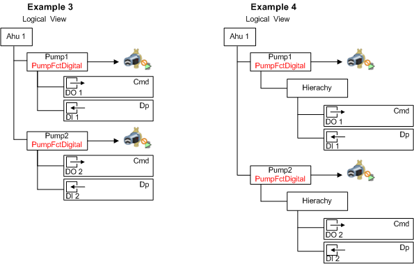 Example 3 shows how a PumpFctDigital Function is created and the .Cmd and .Dp hierarchy information is used for the subordinate objects.