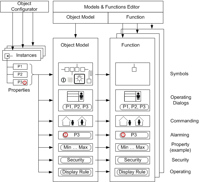 The Models & Functions Editor defines the information relevant to engineering for system objects, for example, detectors or fans. It typically defines the symbol to select during engineering or the operating information to be displayed as per the corresponding user rights. The operator can also define and configure management platform alarms using the Object Configurator.