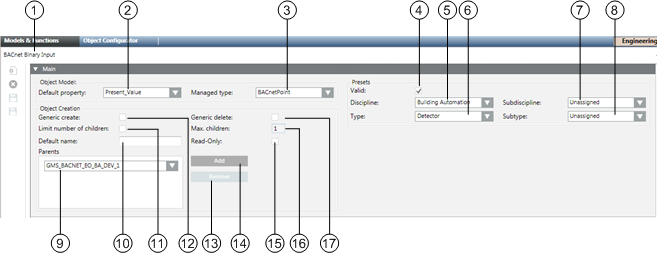 9 | Parents | List of parent elements for the Data Point Type. Configures the object type that can be created by the application. If the Generic Create check box is selected, parent configuration specifies the type of children that can be created in the Object Configurator. |