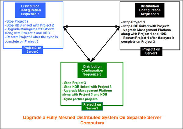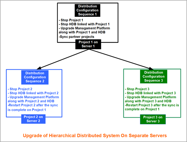 For this, you must first de-link each system in distribution by stopping the respective project on the system, upgrade it individually and then bring it again back in the distribution. You should start this activity by de-linking the supervised systems first, in this case Server 2 and Server 3. This is because these systems have limited dependency and are local systems. Next, de-link the supervising system (Server 1) and upgrade each system one by one before finally bringing them back in distribution.